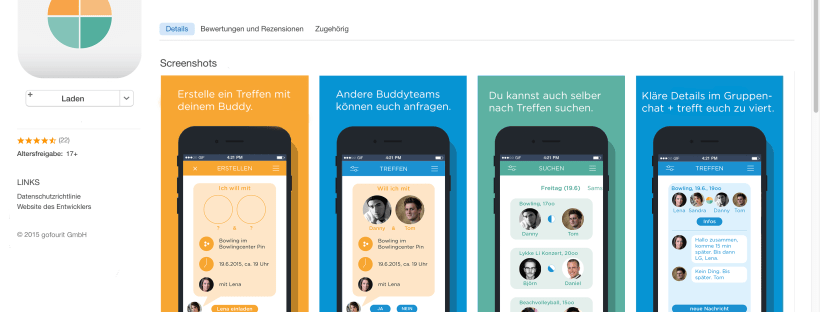 After the analysis and synthesis phase I come up with a set of basic rules (requirements) which I used to come up with different ideas. They were revised and iterated with the help of my colleagues. In the end I developed the concept „gofourit“ by designing a mobile app mockup (Invisionapp), creating a business model canvas and customer journey.